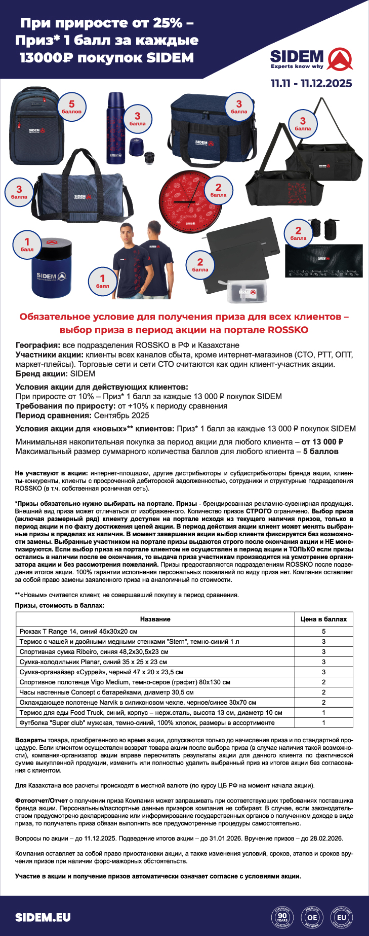 11.11 - 11.12.2025 Акция «При приросте от 10% – Приз* 1 балл за каждые 13000₽ (84312₸) покупок SIDEM»